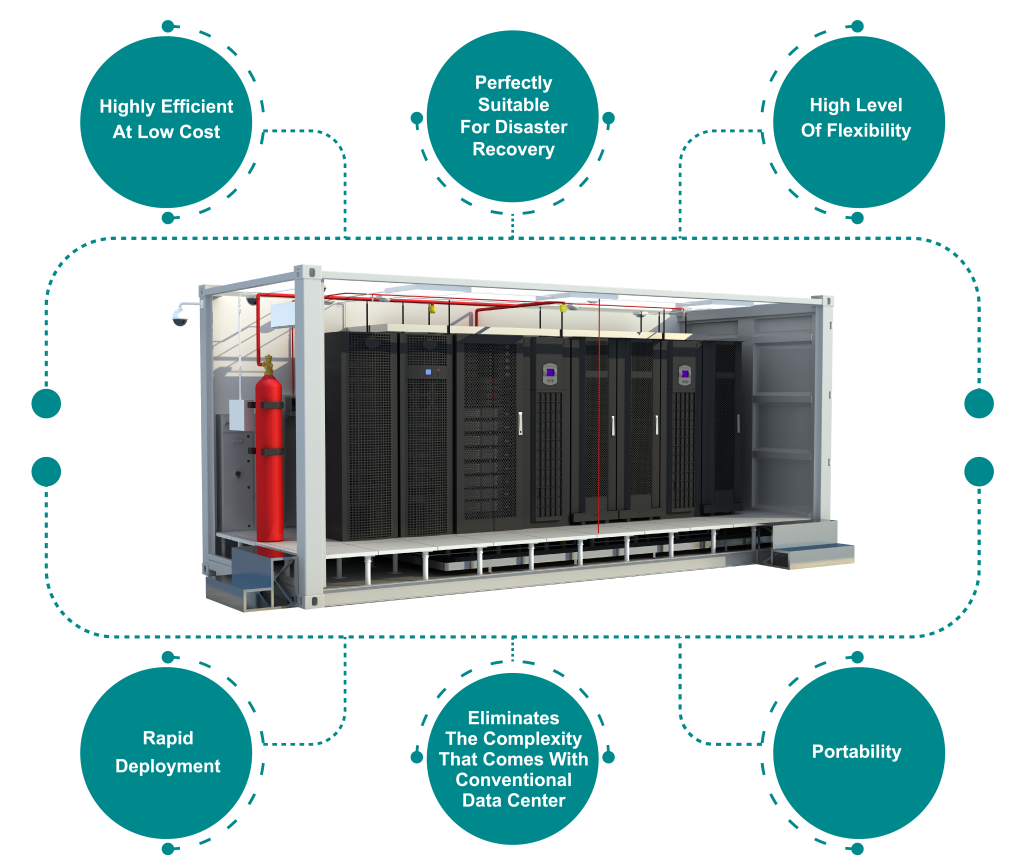 These data centers come in an all-in-one box that delivers unparalleled flexibility, energy efficiency, great cooling, scalable capacity, and better PUE.